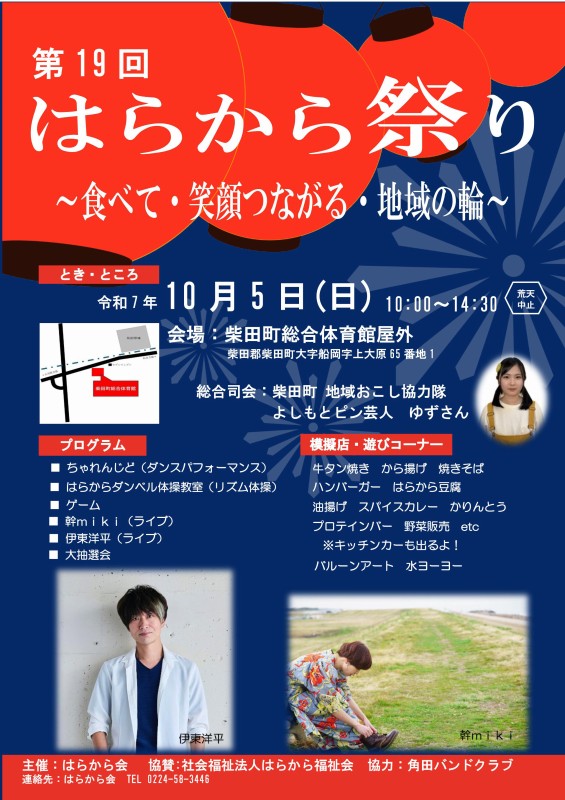 第19回はらから祭りのご案内 「はらから祭り」が、今年も開催されます! 美味しい模擬店、子どもから大人まで楽しめる遊びコーナー、 音楽ライブやダンスパフォーマンスなど盛りだくさん。 最後には豪華景品が当たる「大抽選会」も! 🗓 日時:10月5日(日)10:00~14:30 📍 会場:柴田町総合体育館 屋外 ご家族・ご友人とぜひお立ち寄りください。 みなさまのお越しを心よりお待ちしております!